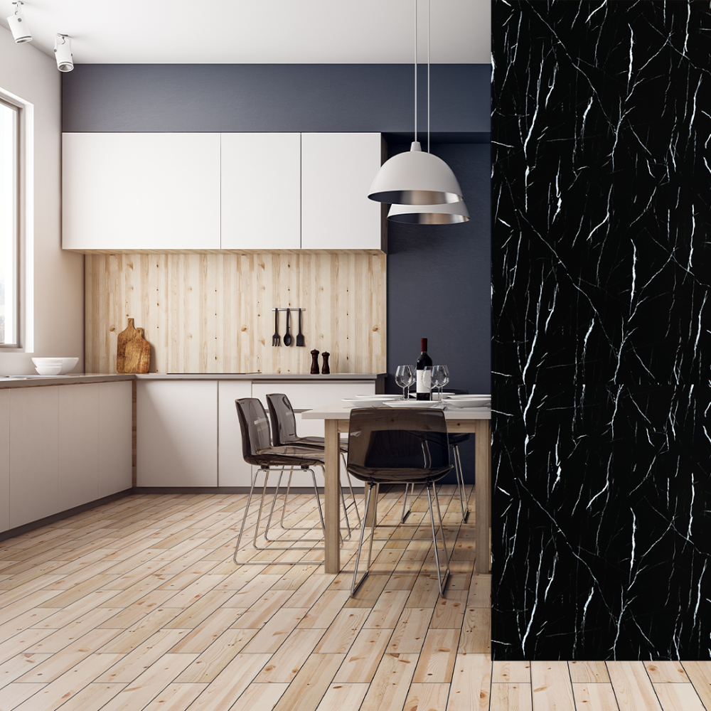 بديل الرخام MG-4 بتصميمه الأسود اللامع وعروقه البيضاء البارزة يمنح المساحات حضورًا قويًا وأناقة غير تقليدية. يتميز بمظهر فاخر يشبه الرخام الطبيعي، مع مقاومة للرطوبة والخدوش وسهولة في التركيب والتنظيف، ما يجعله خيارًا مثاليًا للمشاريع السكنية والتجارية الراقية.